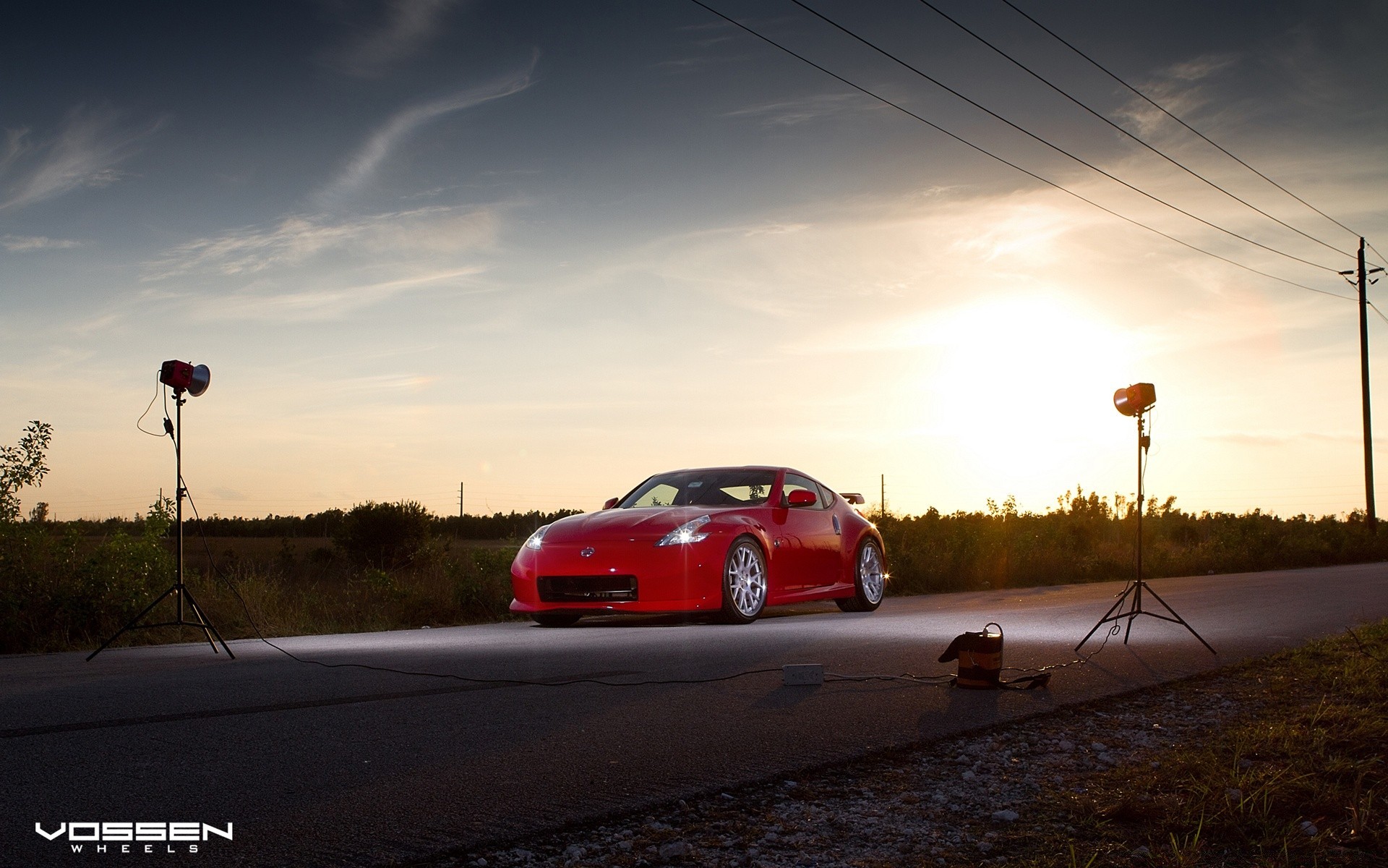 Coche elegante en la carretera durante la puesta del sol