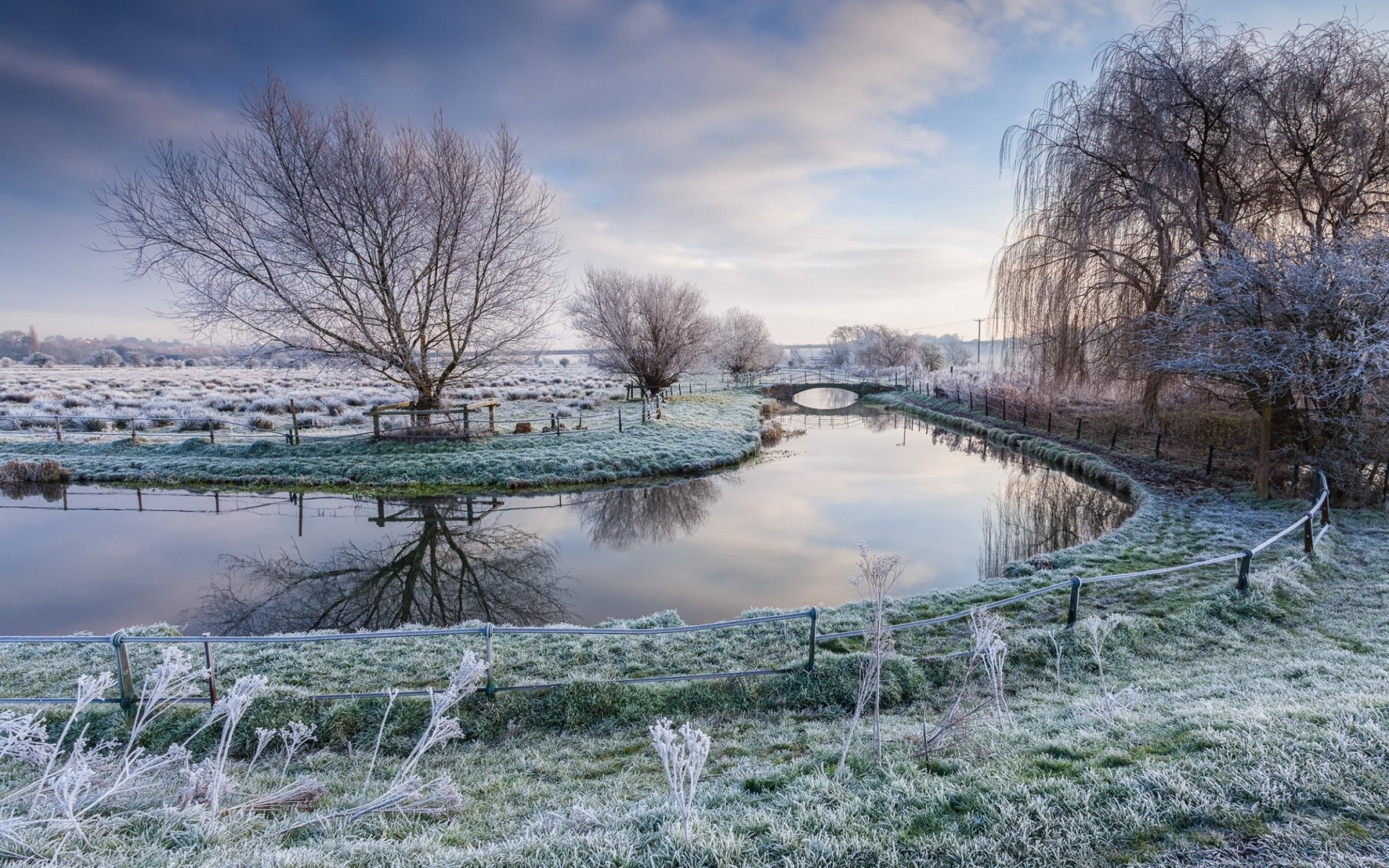 Paisaje de invierno del agua y el reflejo azul del cielo