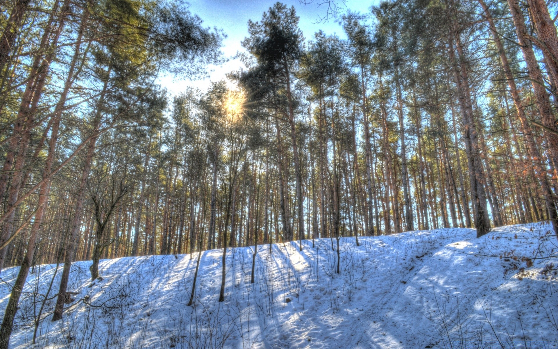 Los rayos del sol brillan a través del bosque de invierno