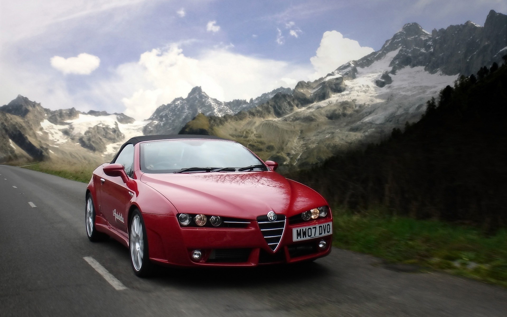 Coche rojo alfa romeo. Paisaje de montaña