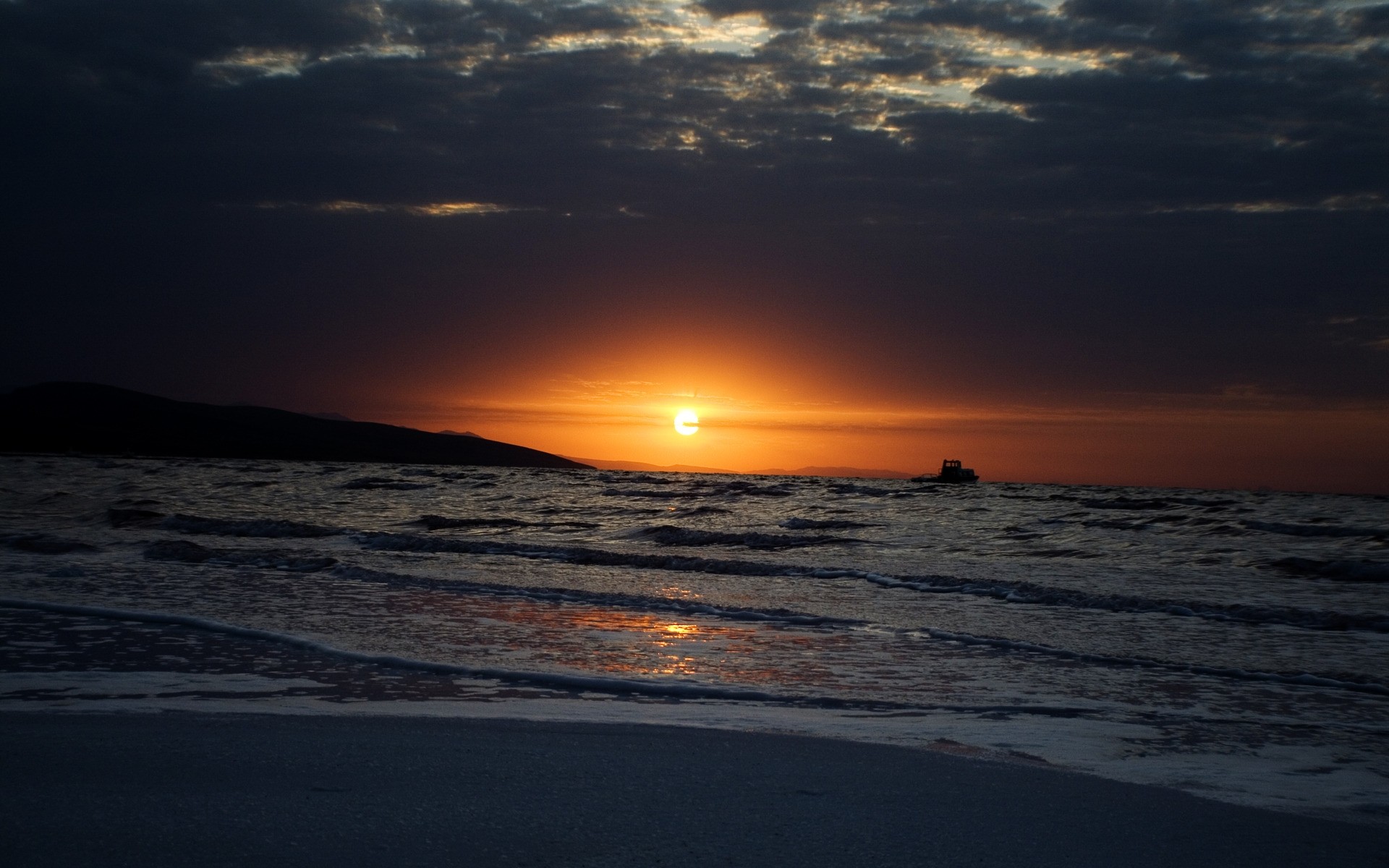 Palmera en la playa junto al océano. Puesta de sol en la playa
