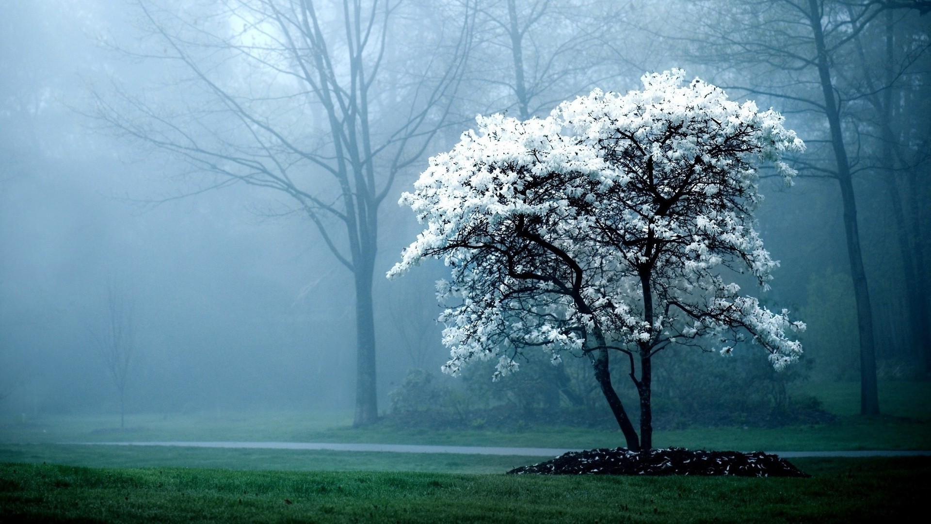Un árbol en las flores blancas de odin se encuentra en la nieblaUn árbol en las flores blancas de Odin se encuentra en la niebla