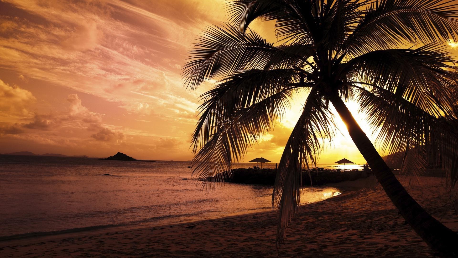 Palma en el fondo de la playa y la puesta de sol en tonos naranjas