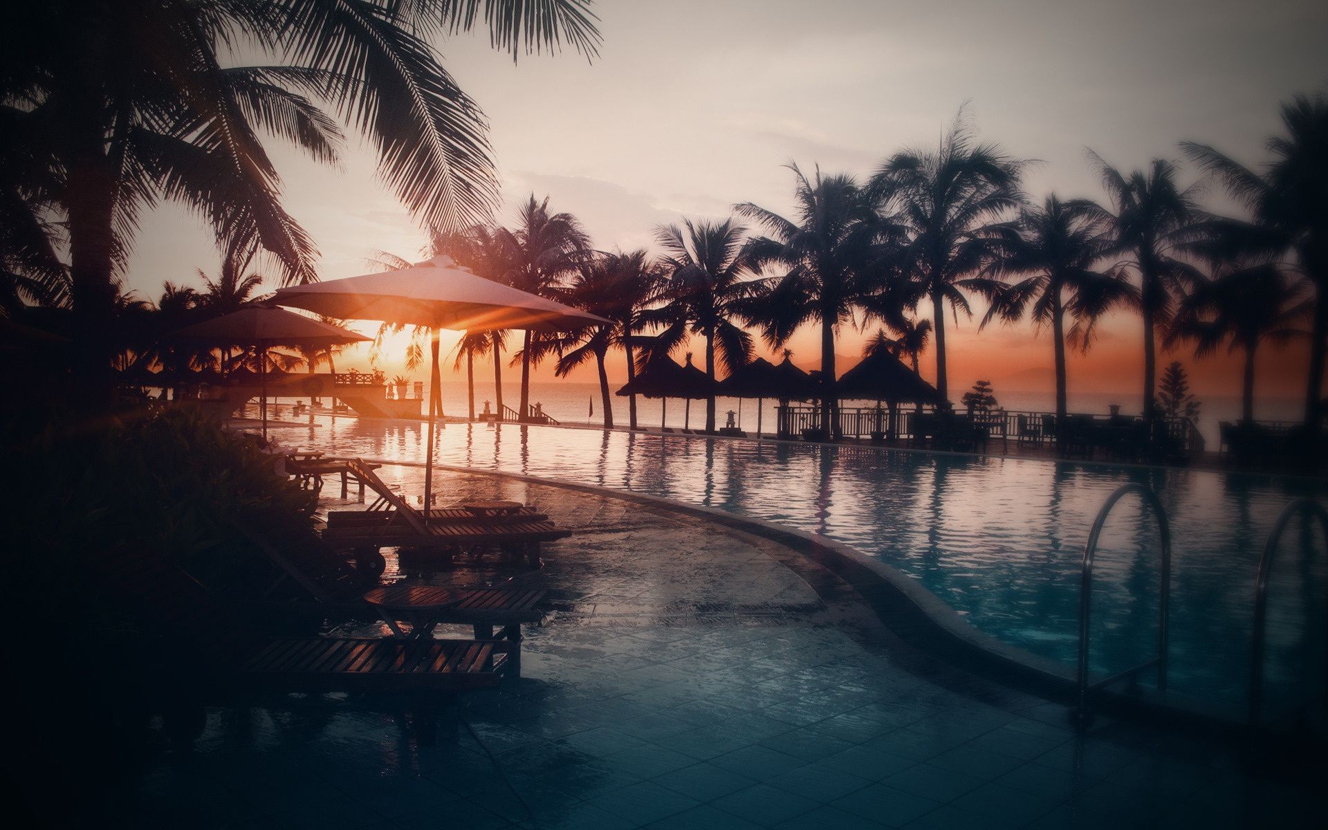 Palmeras, puesta de sol, arena blanca y mar en tonos suaves