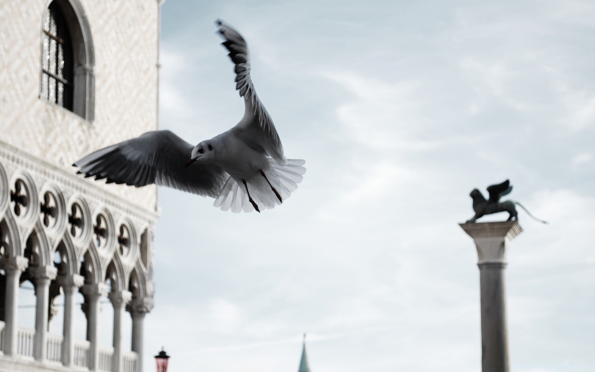 Paloma blanca en el agua en el fondo de la ciudad y la torre Eiffel