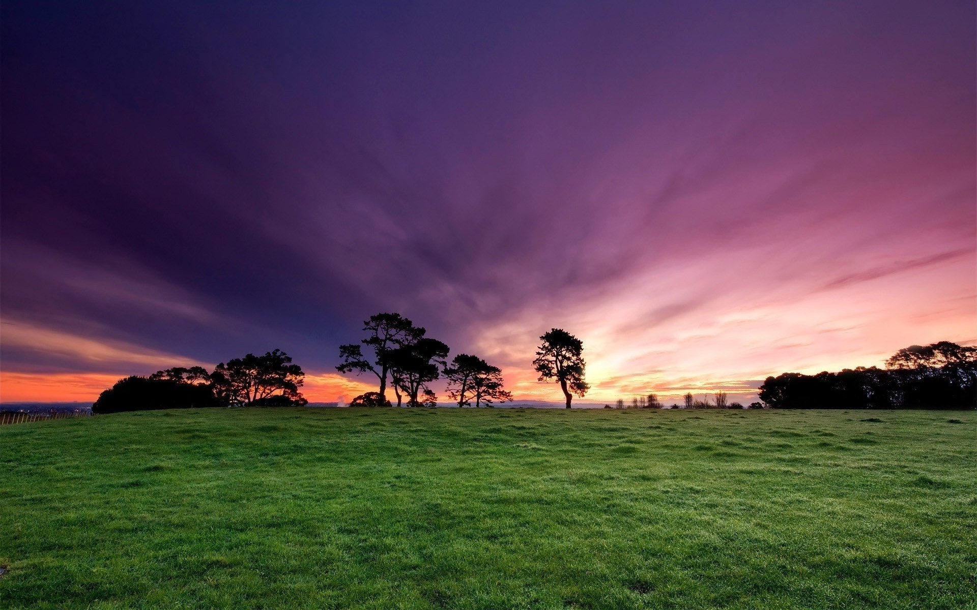 Cielo rojo al atardecer sobre un campo verde