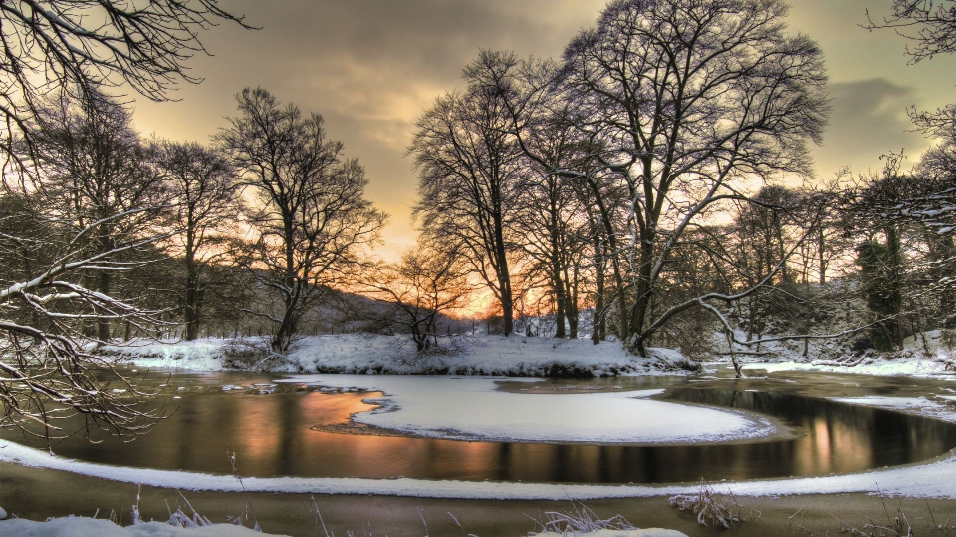 Paisaje de invierno: árboles y estanque