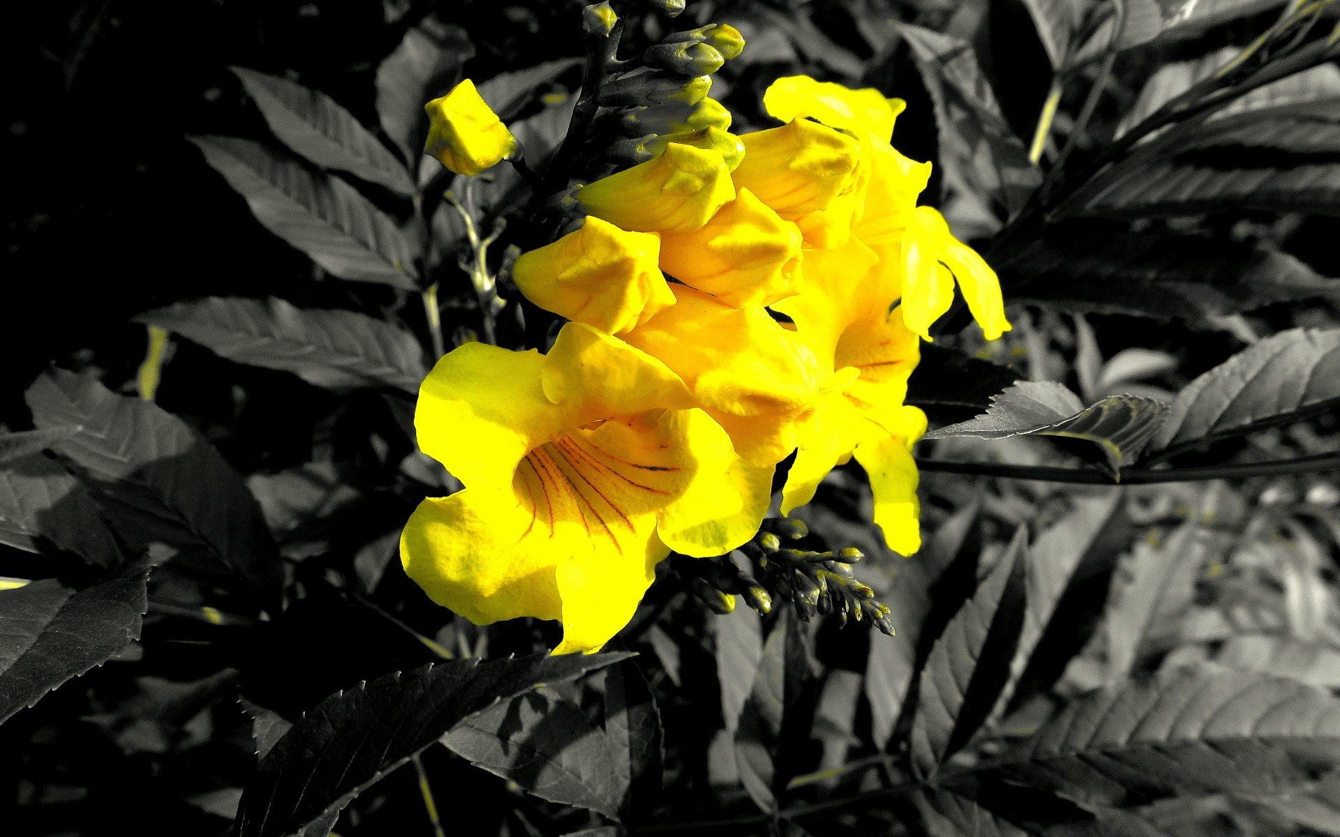 Flores amarillas brillantes sobre un fondo monocromáticoFlores amarillas brillantes sobre un fondo monocromático