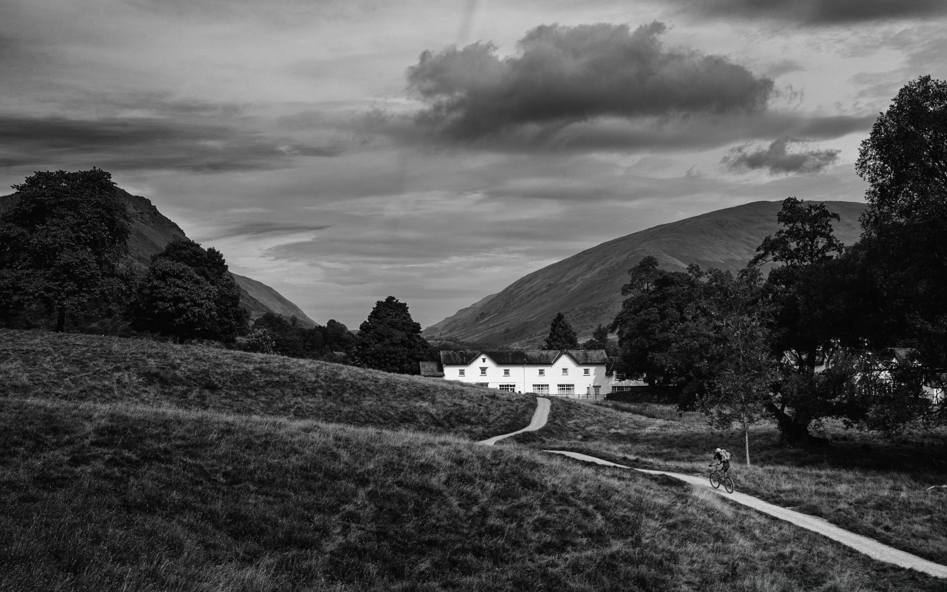Paisaje en blanco y negro del cielo y las montañas camino para viajar