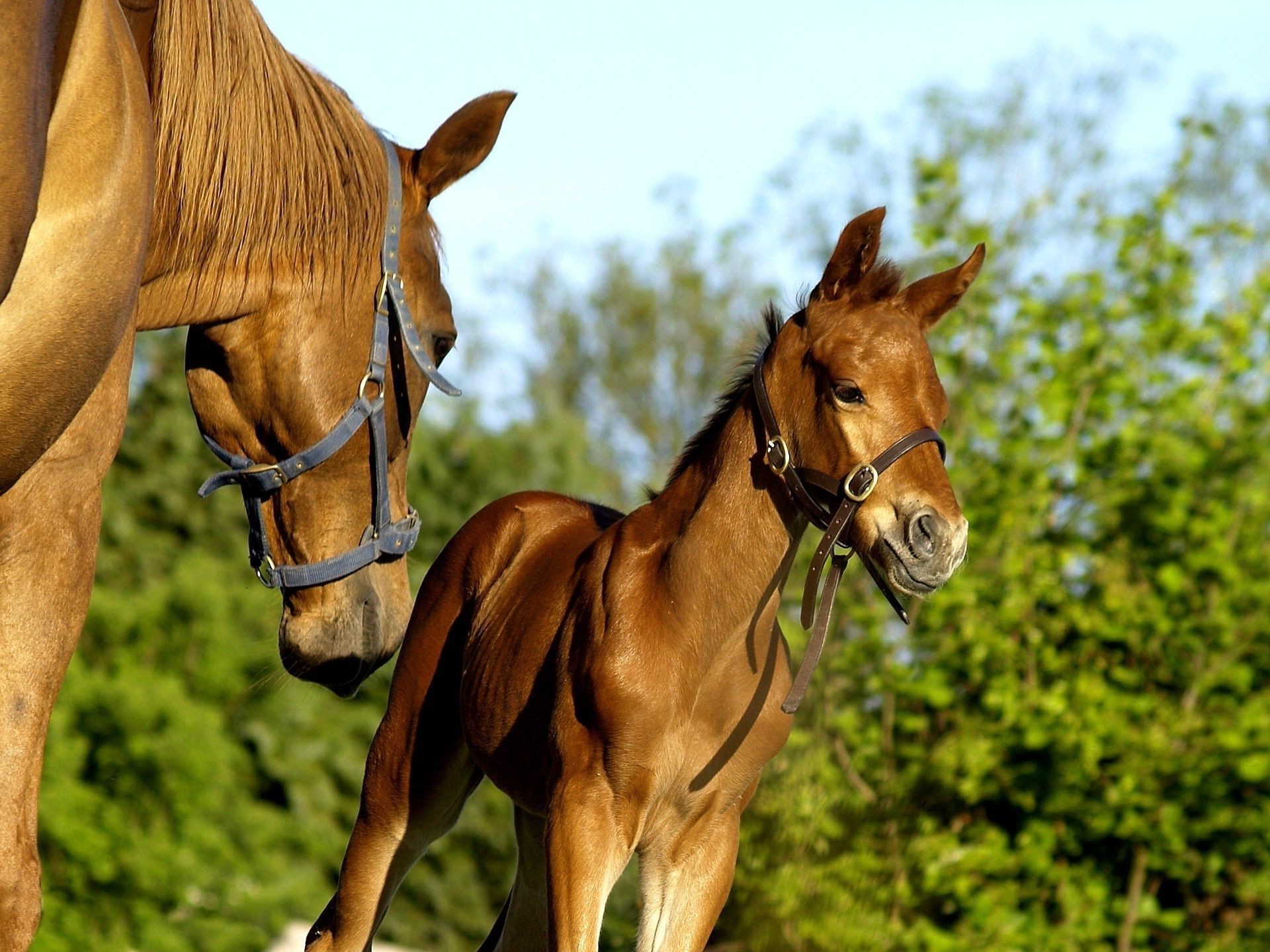 Potro dorado con mamá en la naturaleza