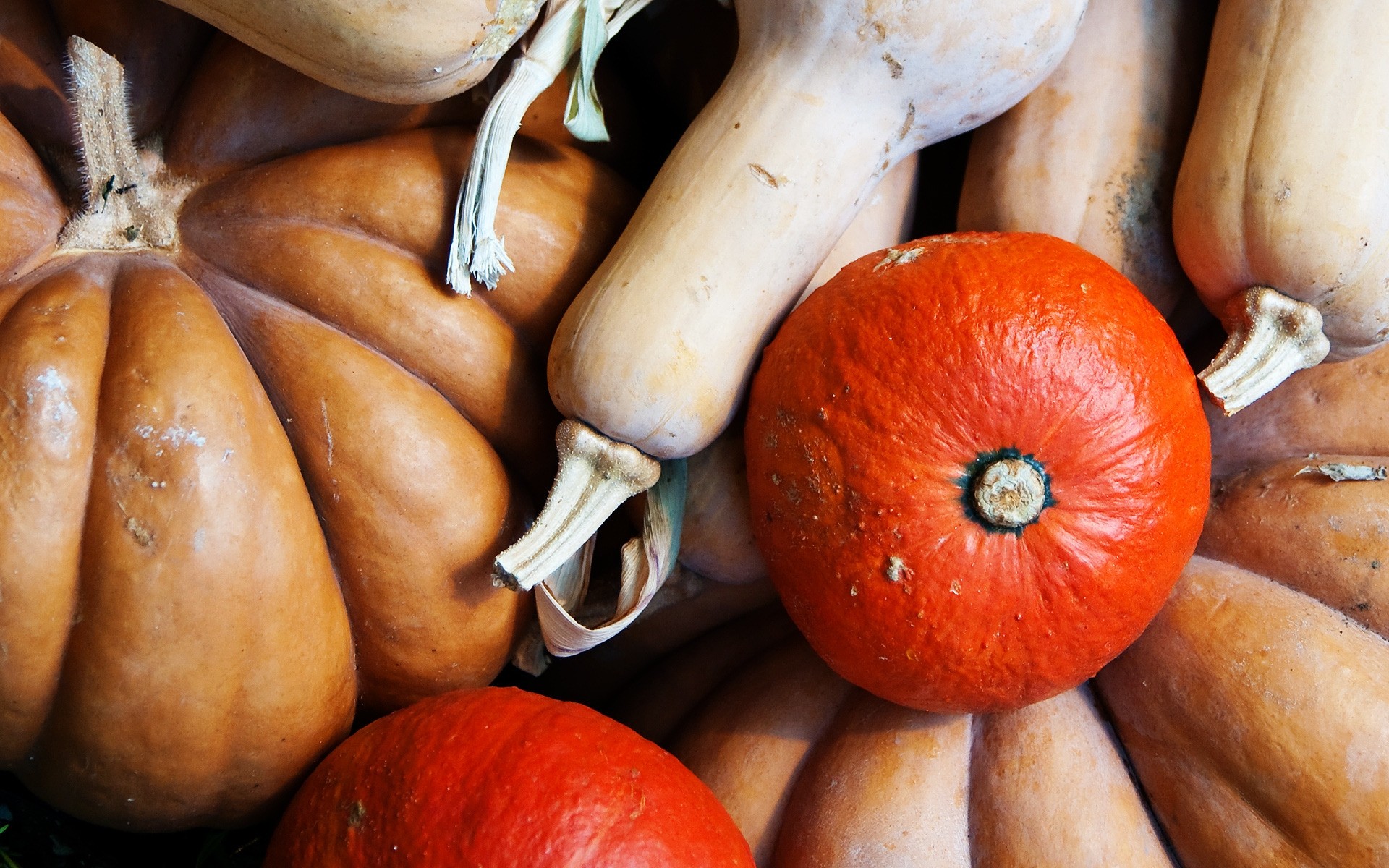 Bodegón de calabazas multicolores y calabazas