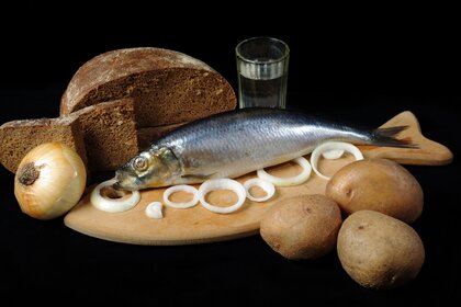 Fiesta rusa. arenque, vodka, pan de centeno negro, luchek, patatasFiesta rusa. Arenque, vodka, pan de centeno negro, luchek, patatas