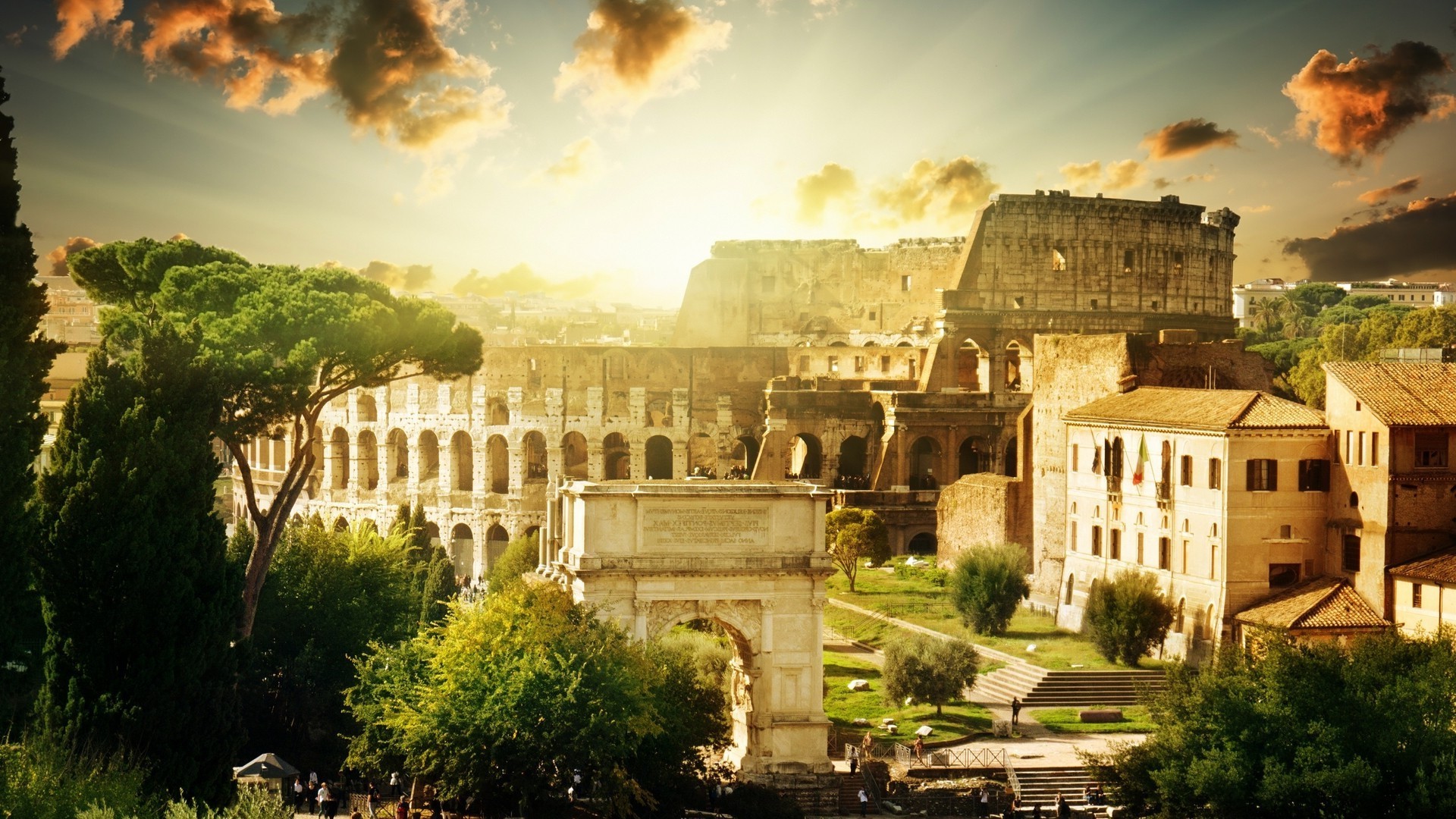 Paisaje de la ciudad de la tarde cerca de las montañas