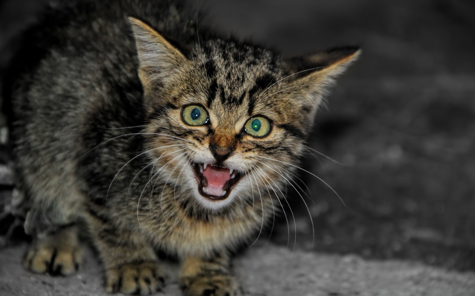 Lindo gatito subió a un soporte de piel. El gatito Mira de arriba hacia abajo