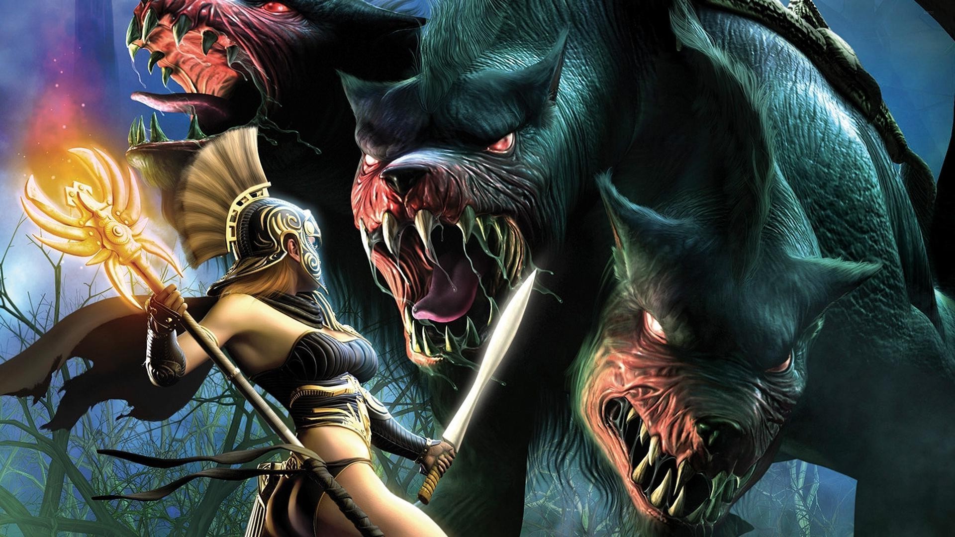 Dibujo gráfico de la valquiria. Perro Baskerville de tres cabezas