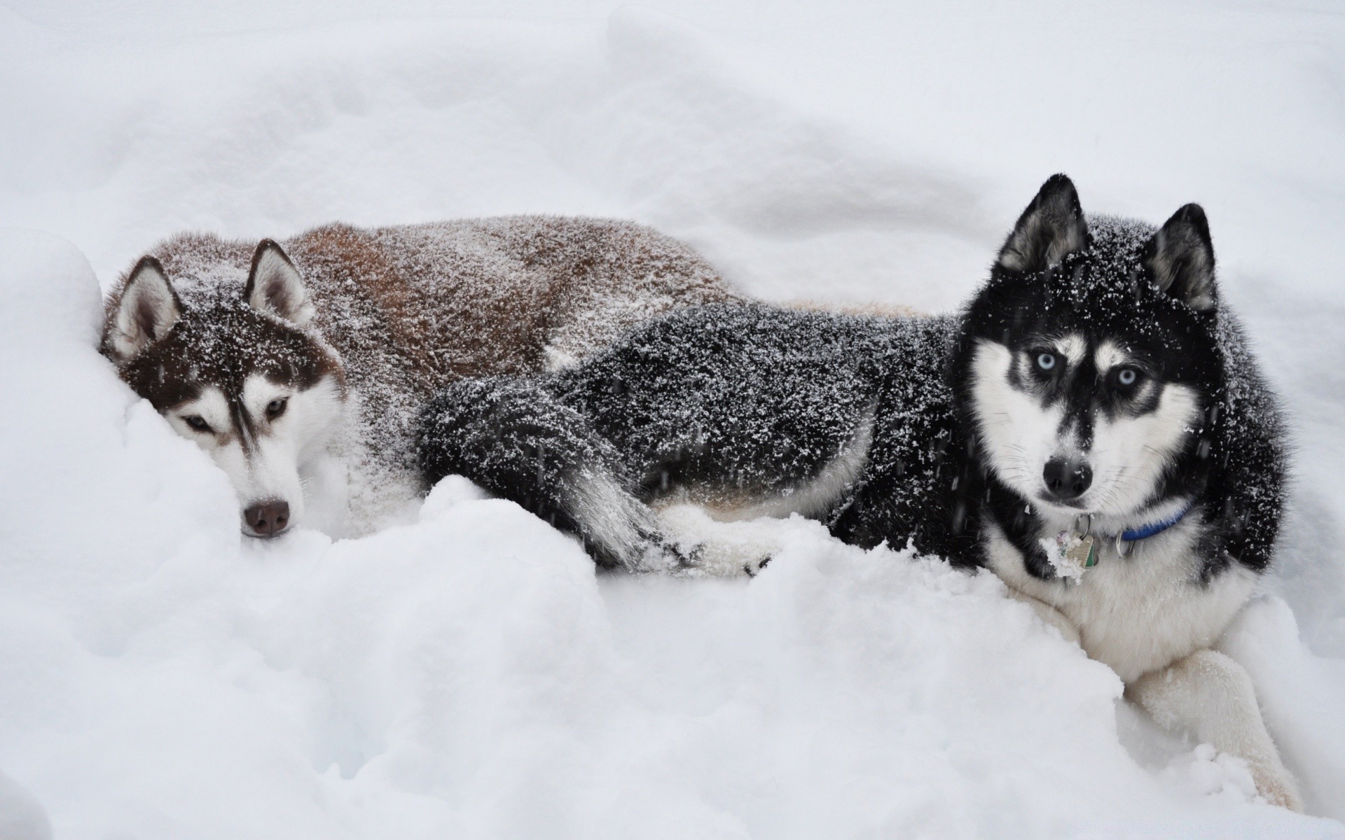 Dos Huskies yacen en la nieve