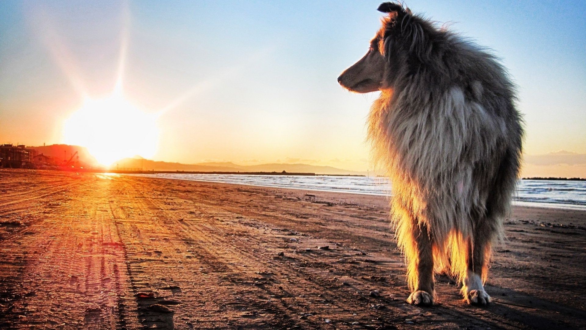 Perro fiel espera en la orilla mientras el dueño se baña en el mar