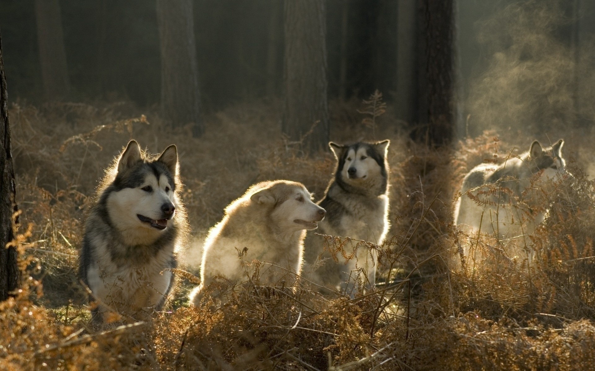 Manada de lobos en el bosque de niebla