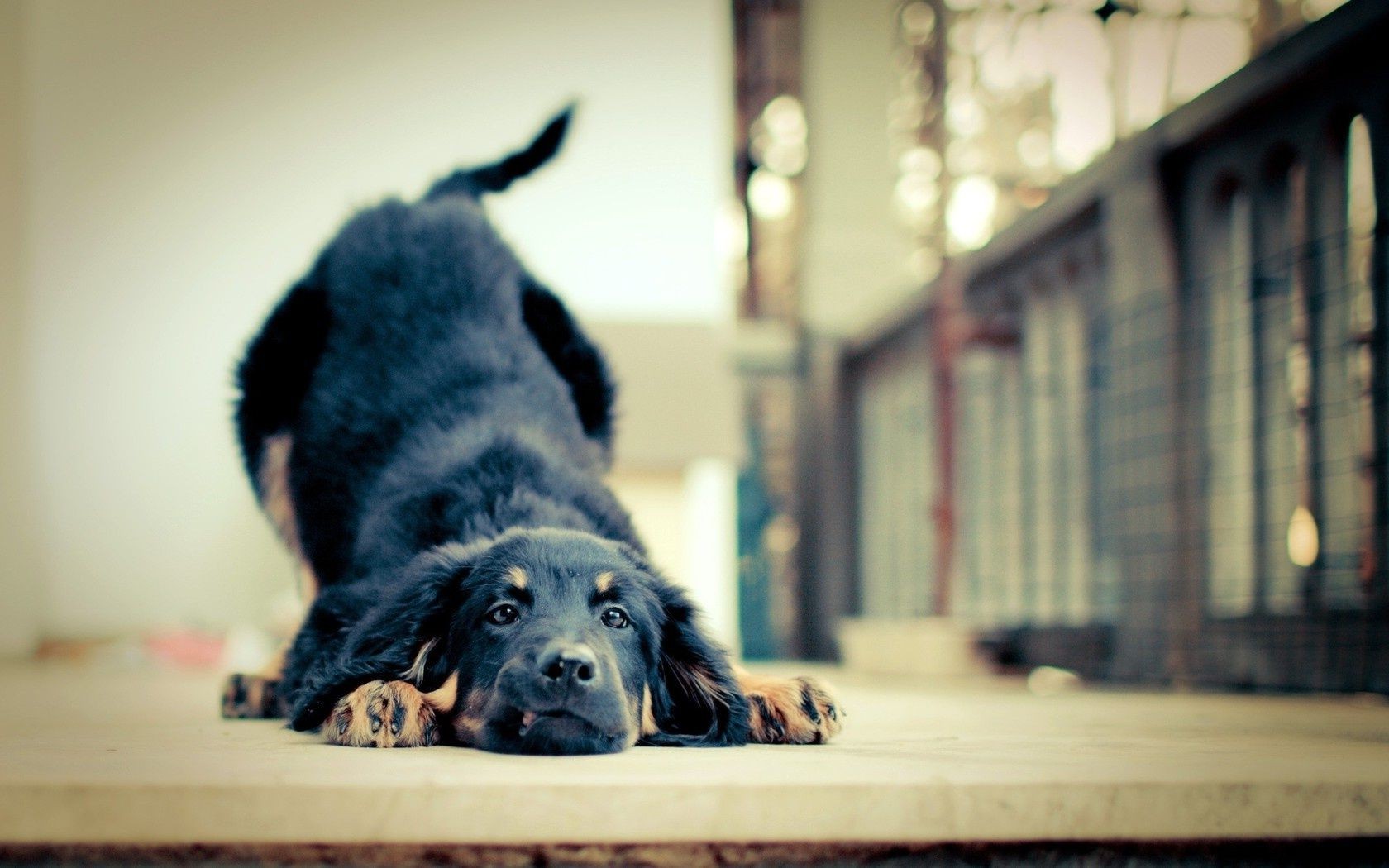 El perro se lame mientras está en la encuadernación en el fondo borroso de la calle