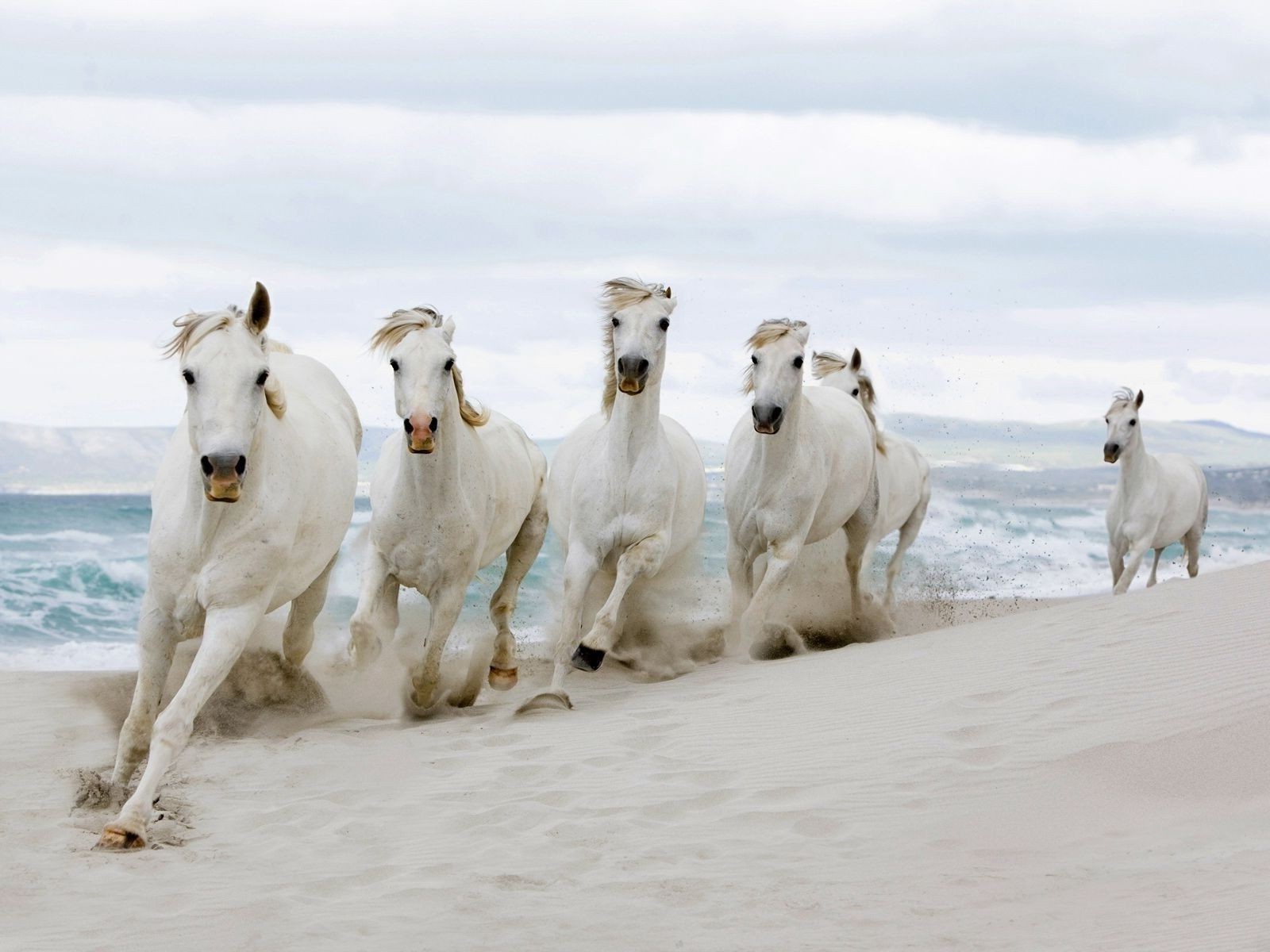 Caballos blancos corriendo por la arena blanca de la playa