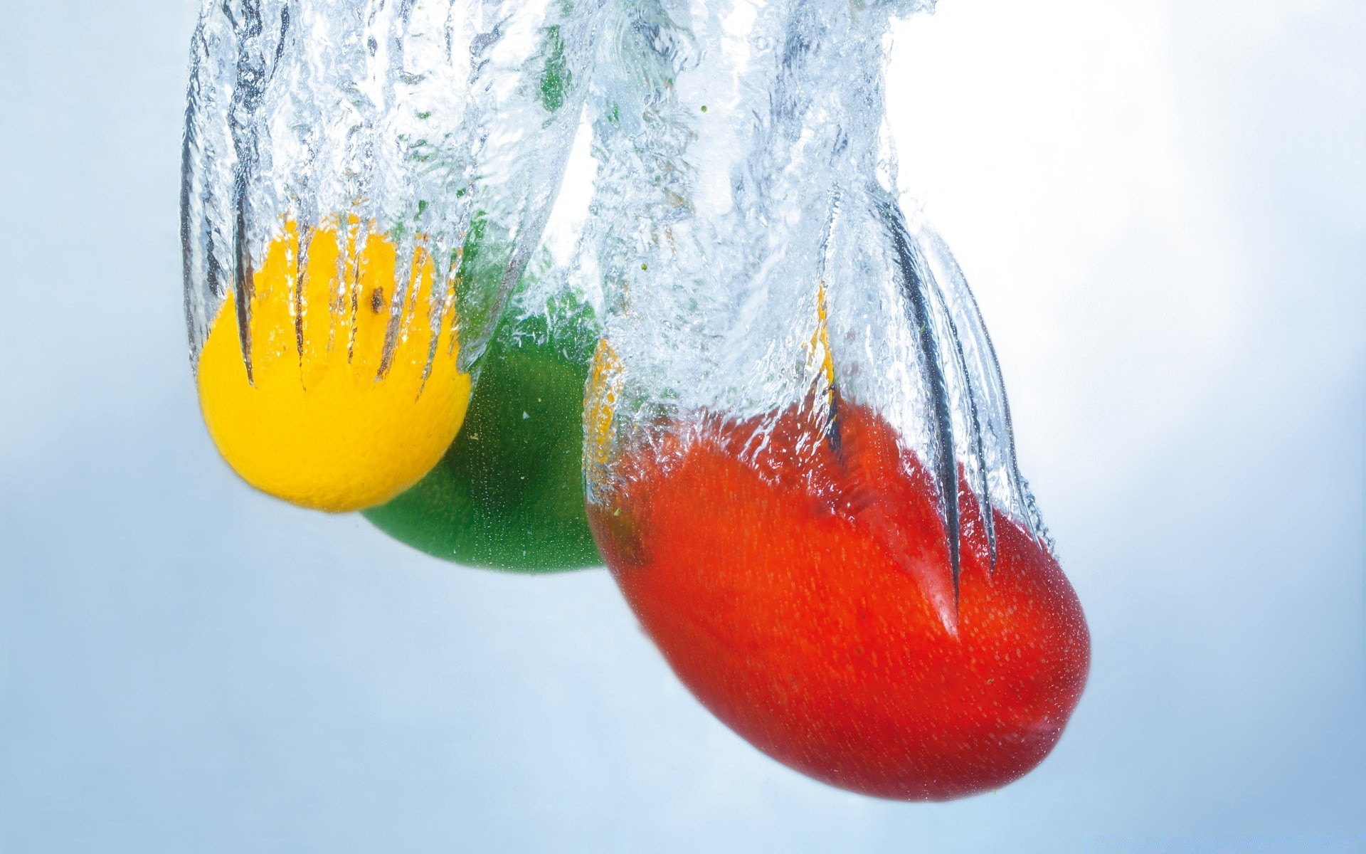 Las frutas amarillas, rojas y verdes brillantes caen al agua