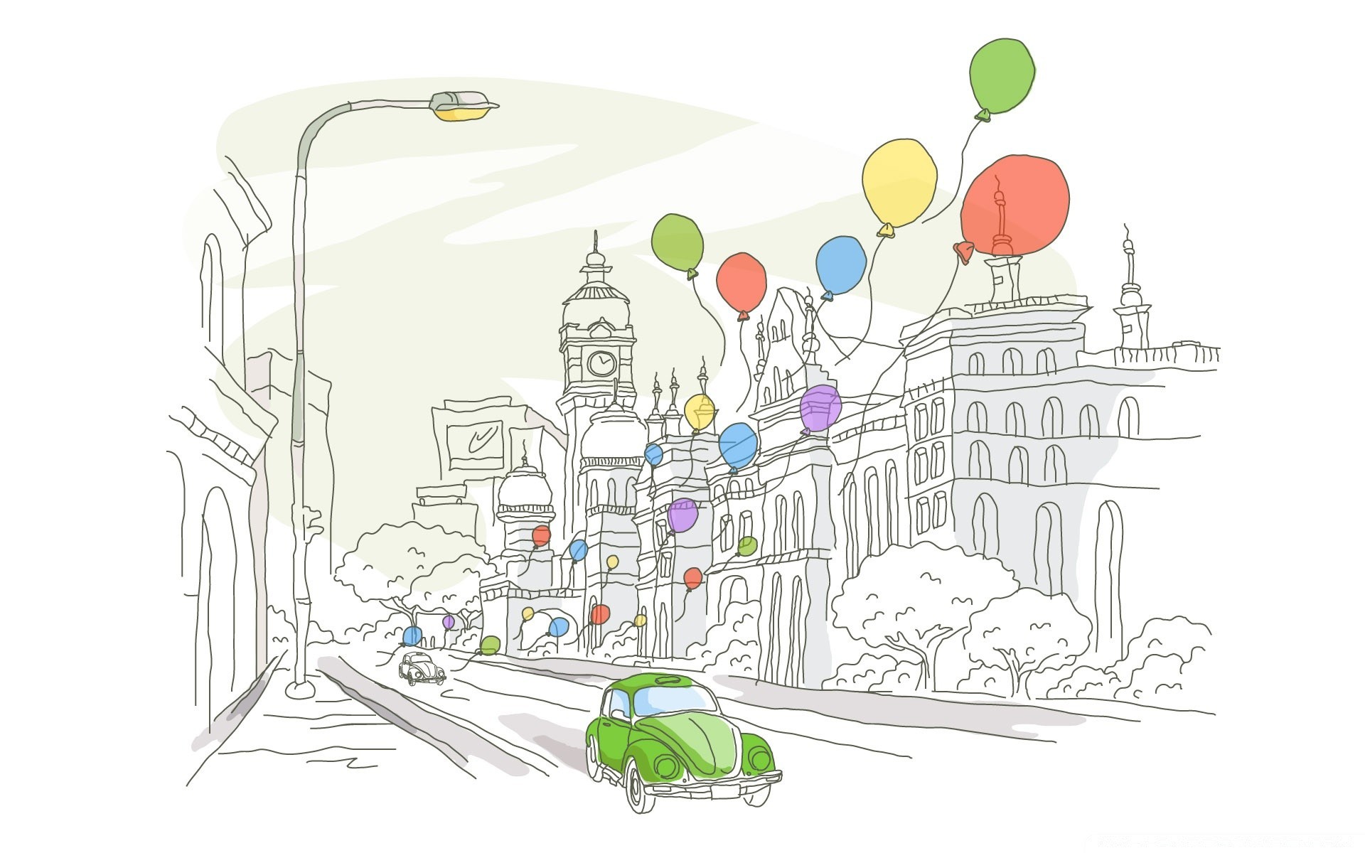 Dibujo de coches verdes y globos en la calle de la ciudadDibujo de coches verdes y globos en la calle de la ciudad