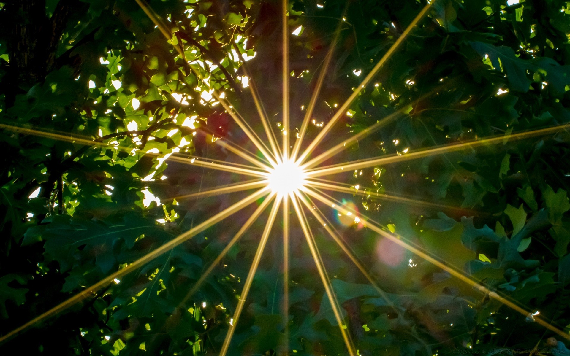 El brillante sol de la puesta del sol se esconde detrás del follaje