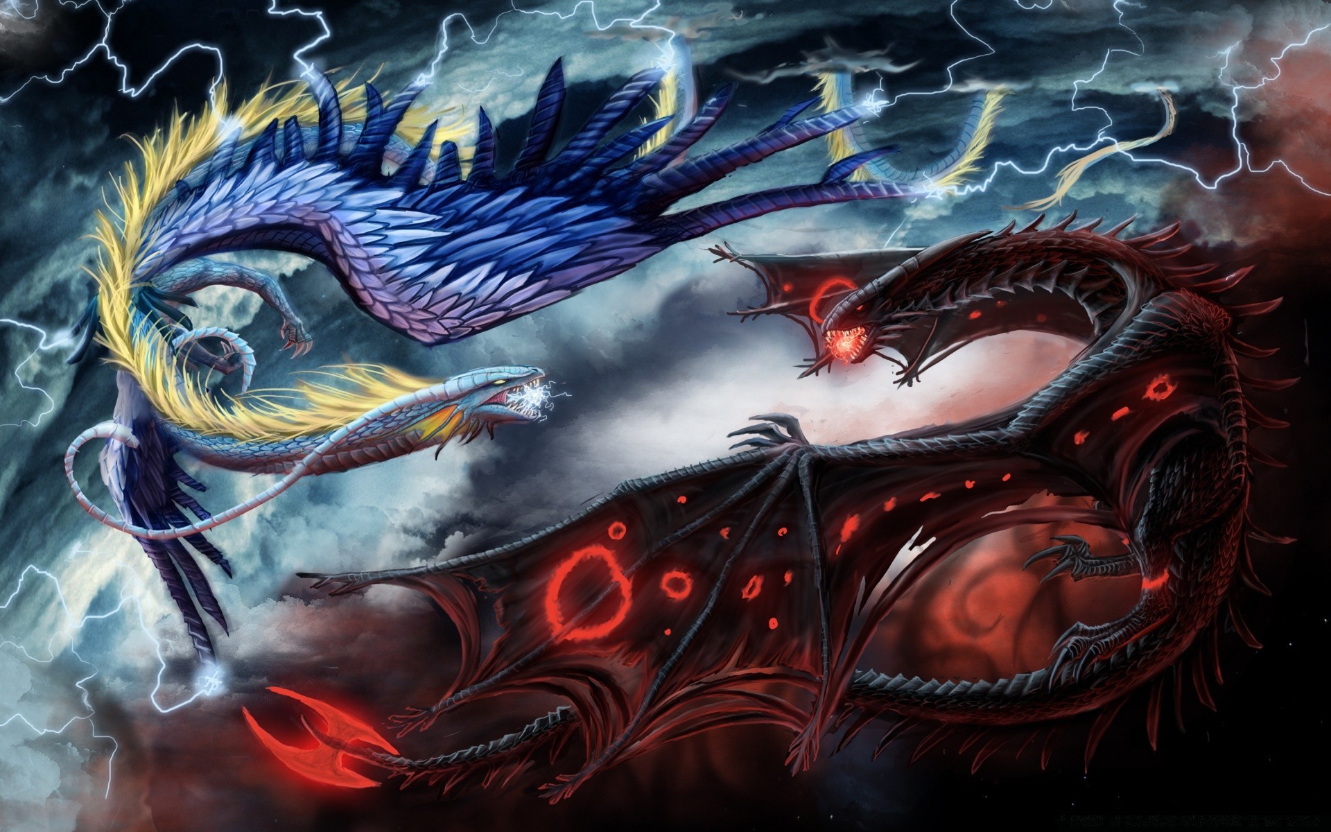 Batalla de dragones de fuego y trueno. Dragones de fantasía. Elementos