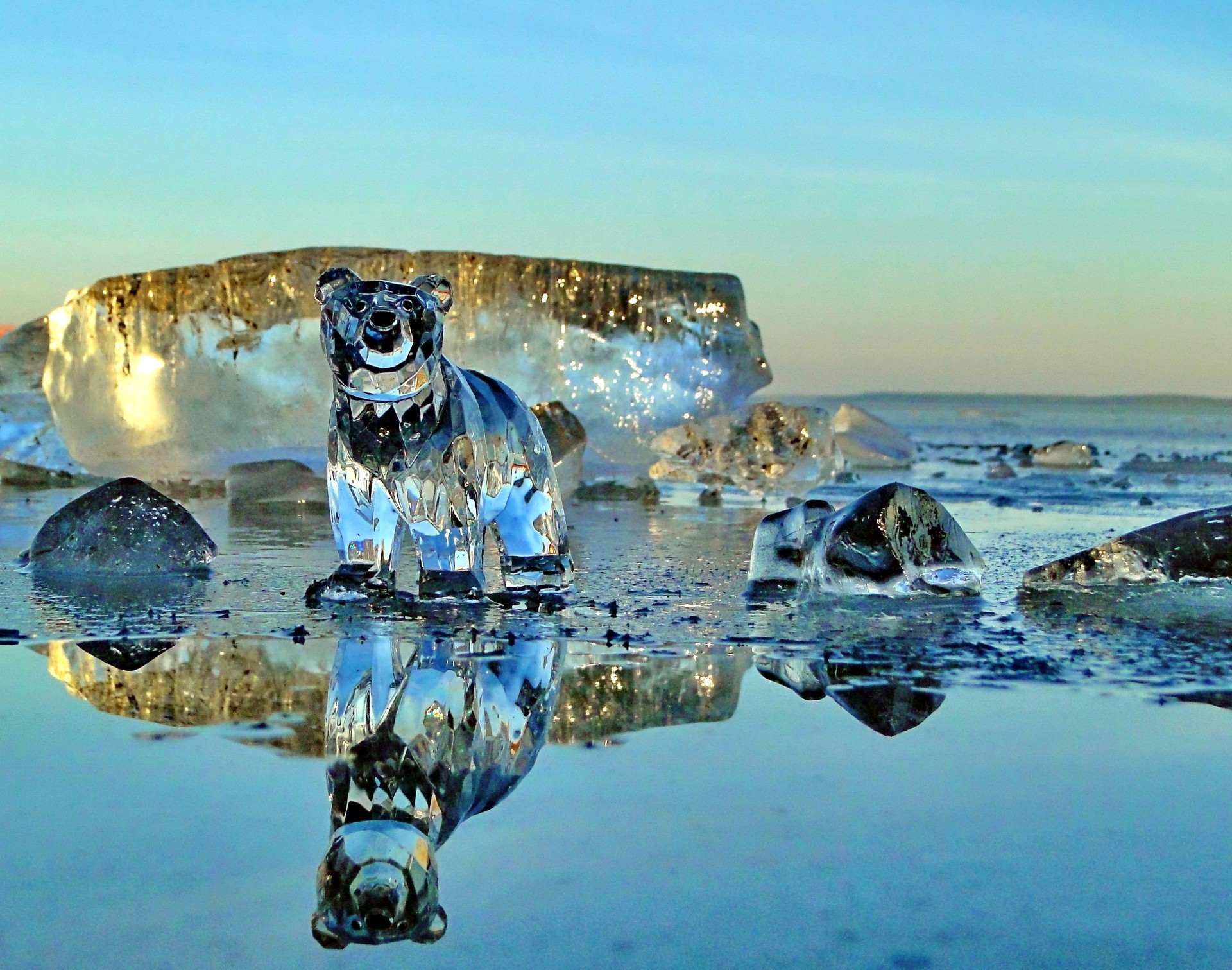 Oso de cristal en un lago cubierto de hielo