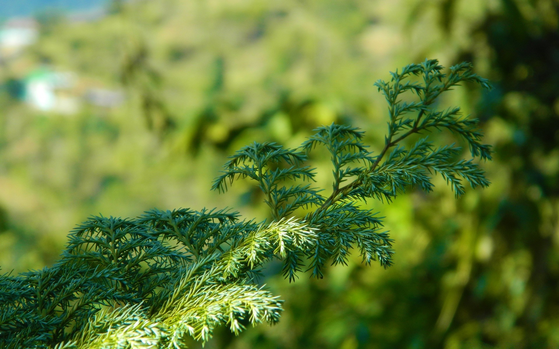 Ramas con hojas verdes sobre el fondo azul del bosqueRamas con hojas verdes sobre el fondo azul del bosque