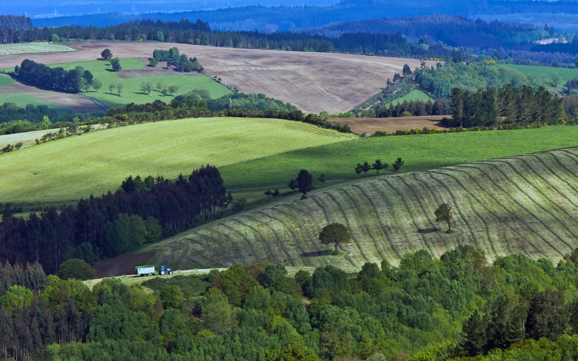 El bosque caducifolio es reemplazado por un campo arado y continúa en una serie de prados