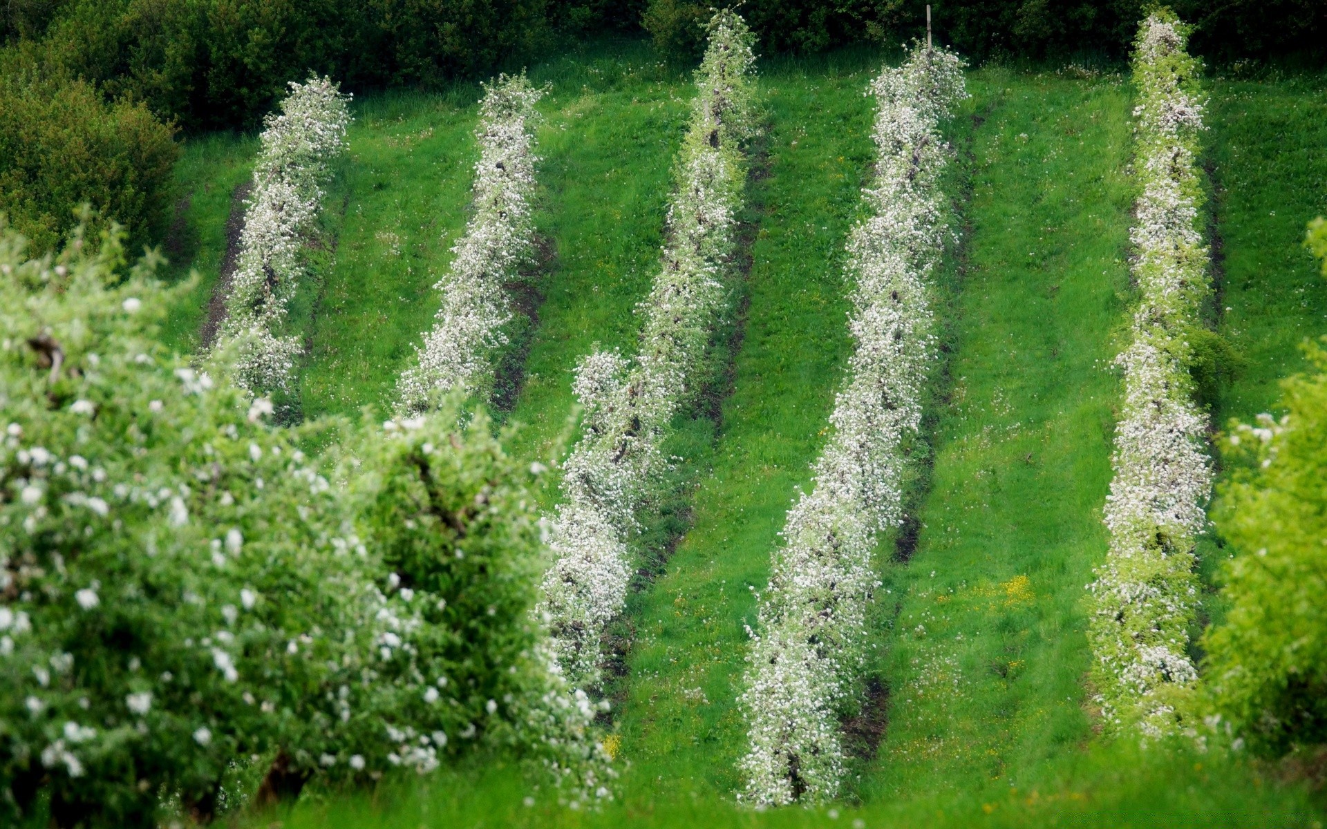 Árboles florecientes en hileras