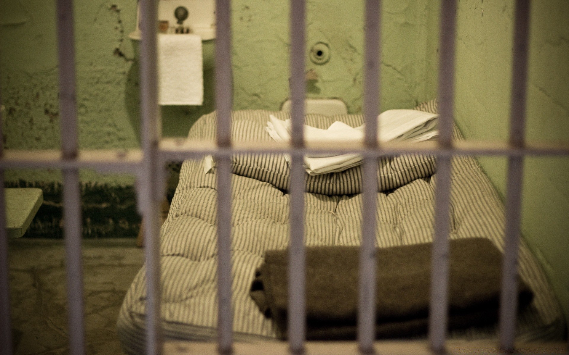 Interior de la celda de la prisión a través de la rejilla