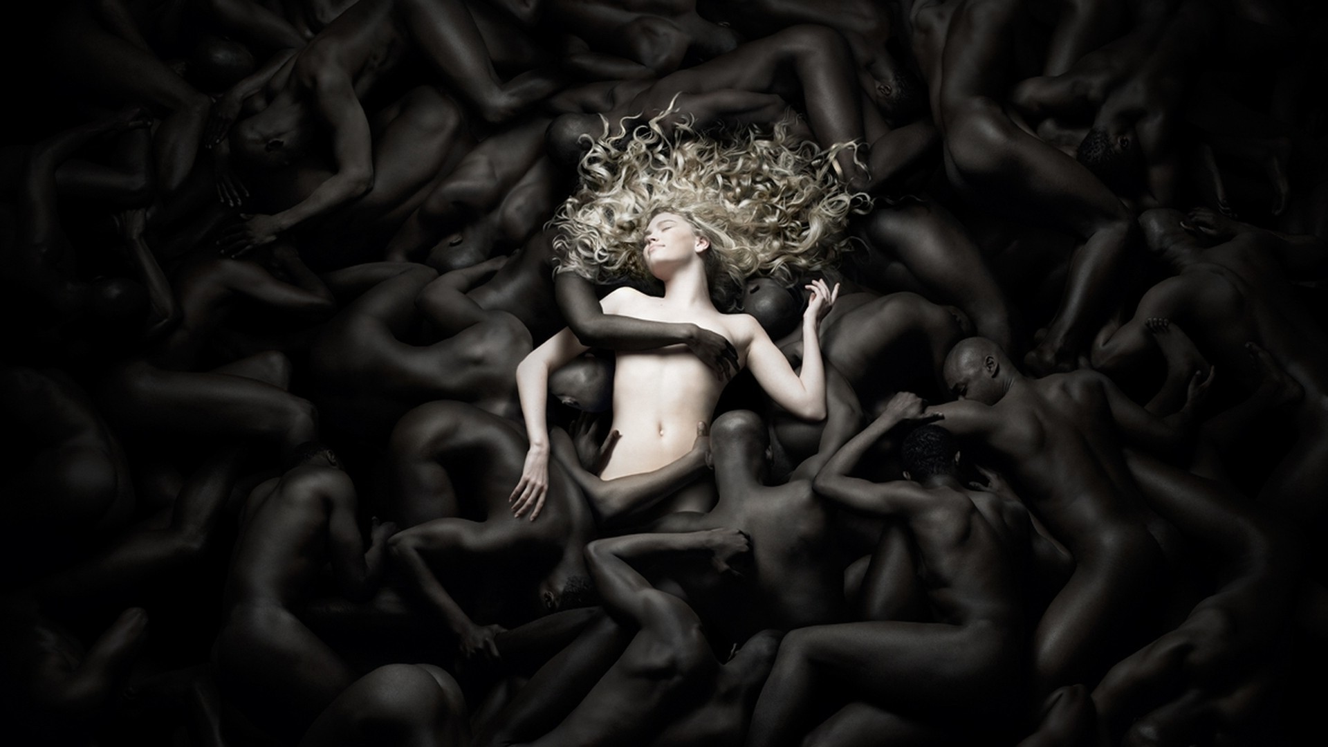 Hermosa chica en los hombres negros