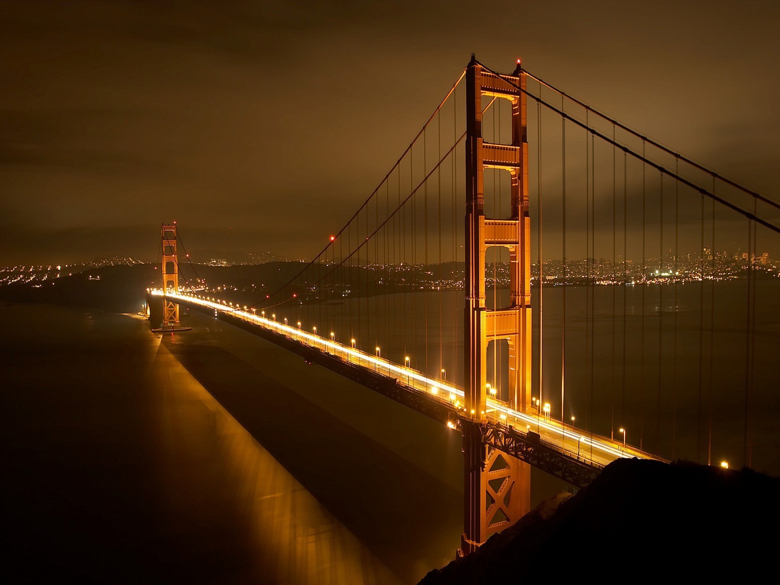 Foto nocturna de la bahía con el puente y la ciudad nocturna en luces
