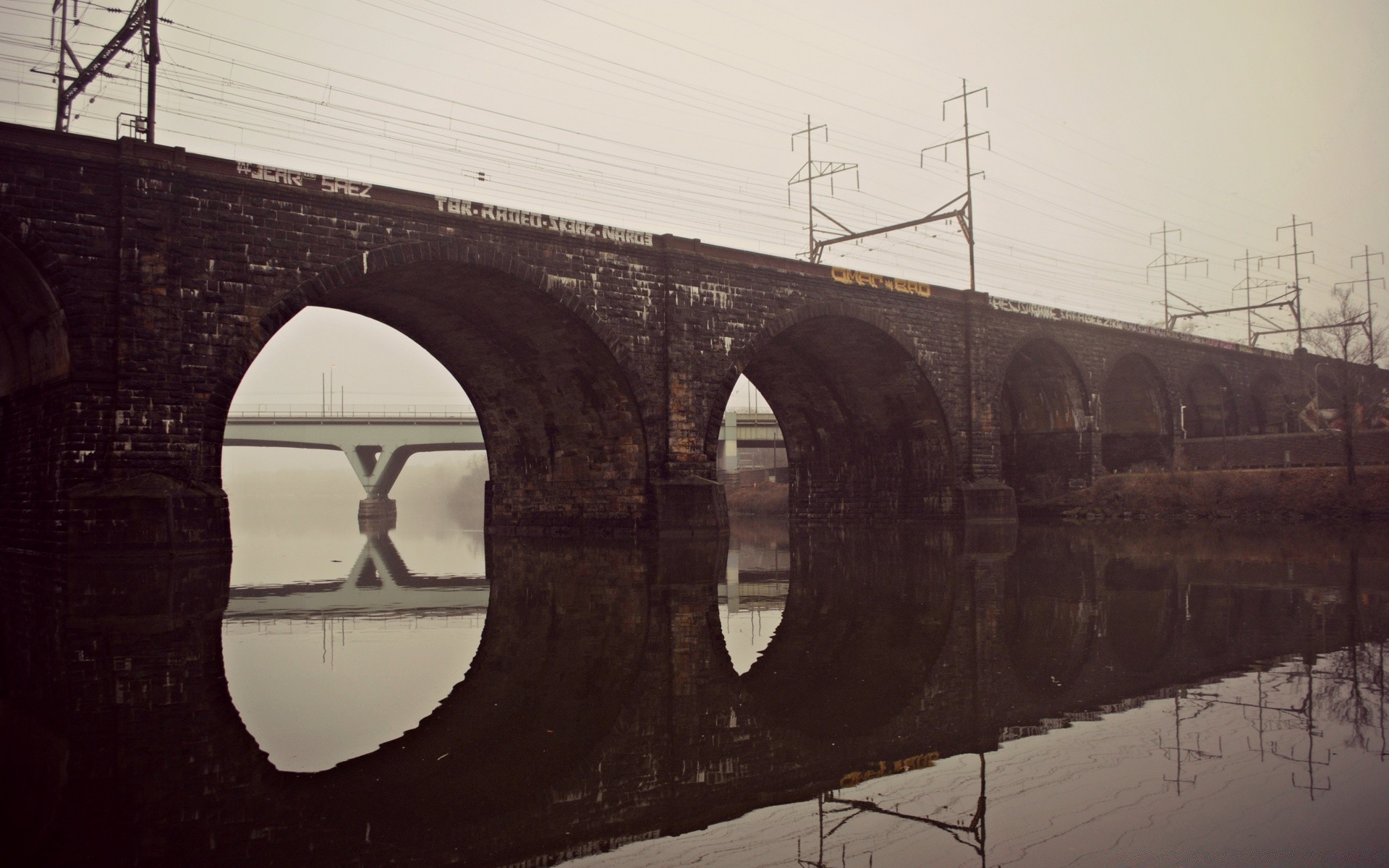 Paisaje de puente Vintage con niebla