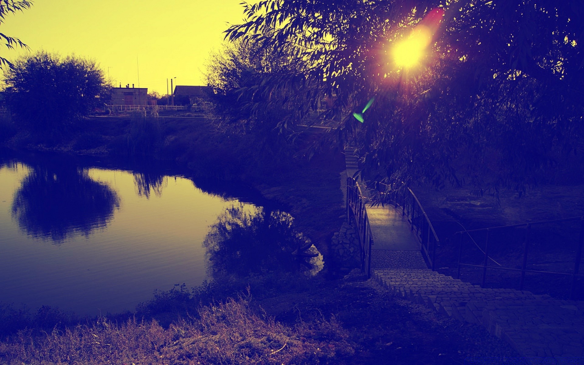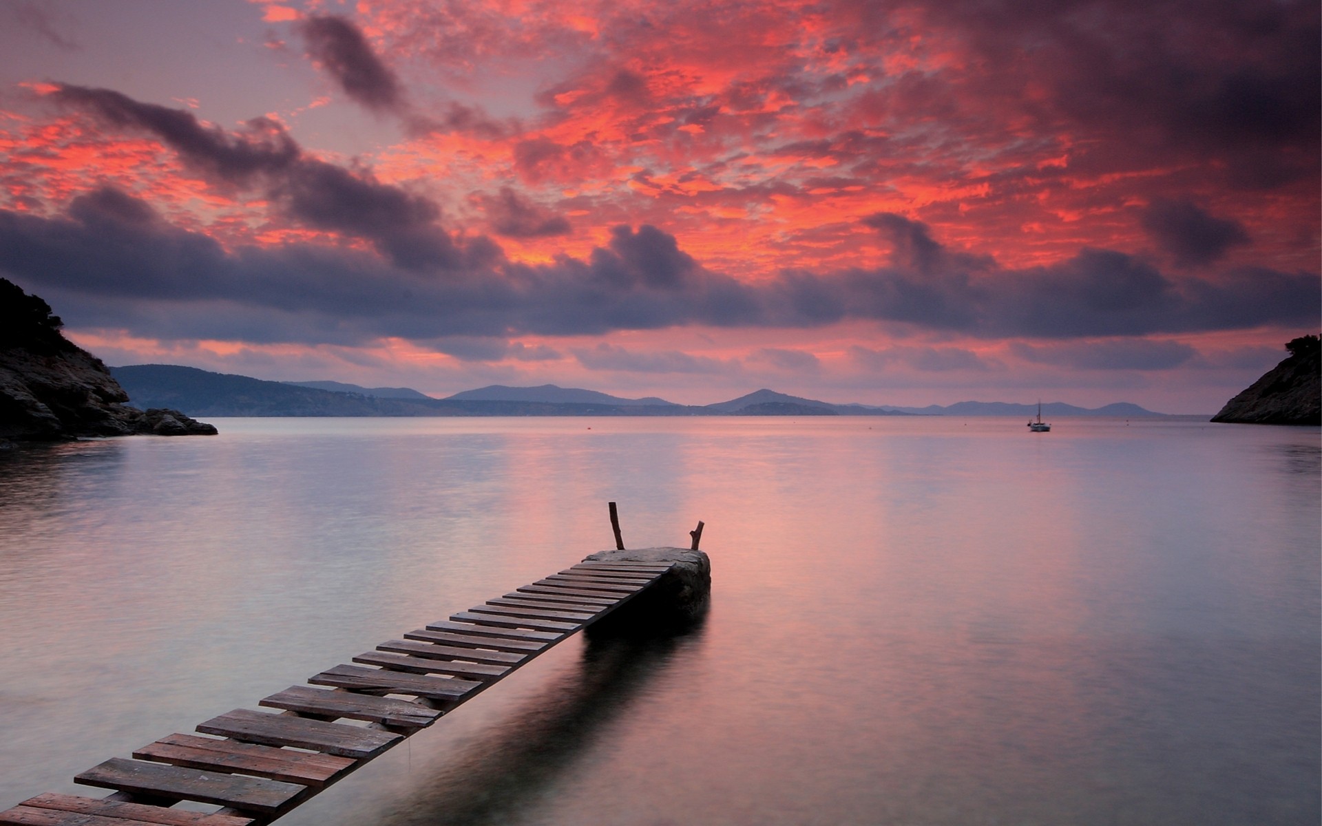 Un puente en la distancia y las olas en el fondo de un cielo rosa y azul