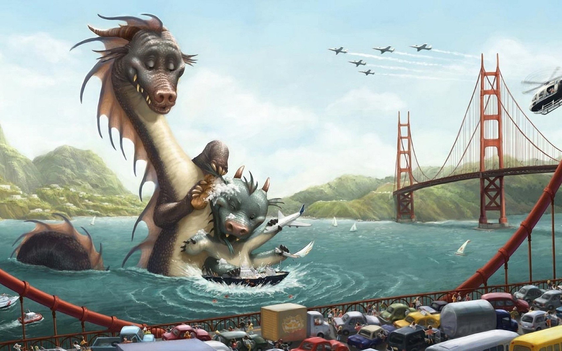 Extraña caricatura, dos dragones jugando cerca de un puente largo