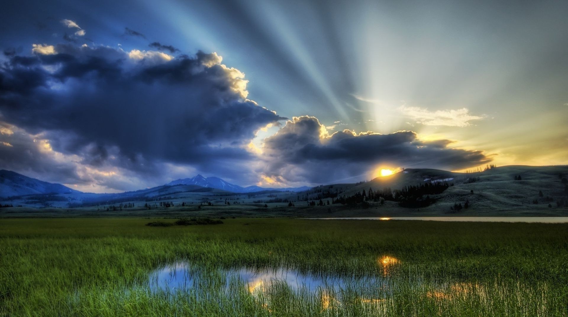 Un árbol solitario cerca de un lago entre las montañas en medio de una puesta de solUn árbol solitario cerca de un lago entre las montañas en medio de una puesta de sol