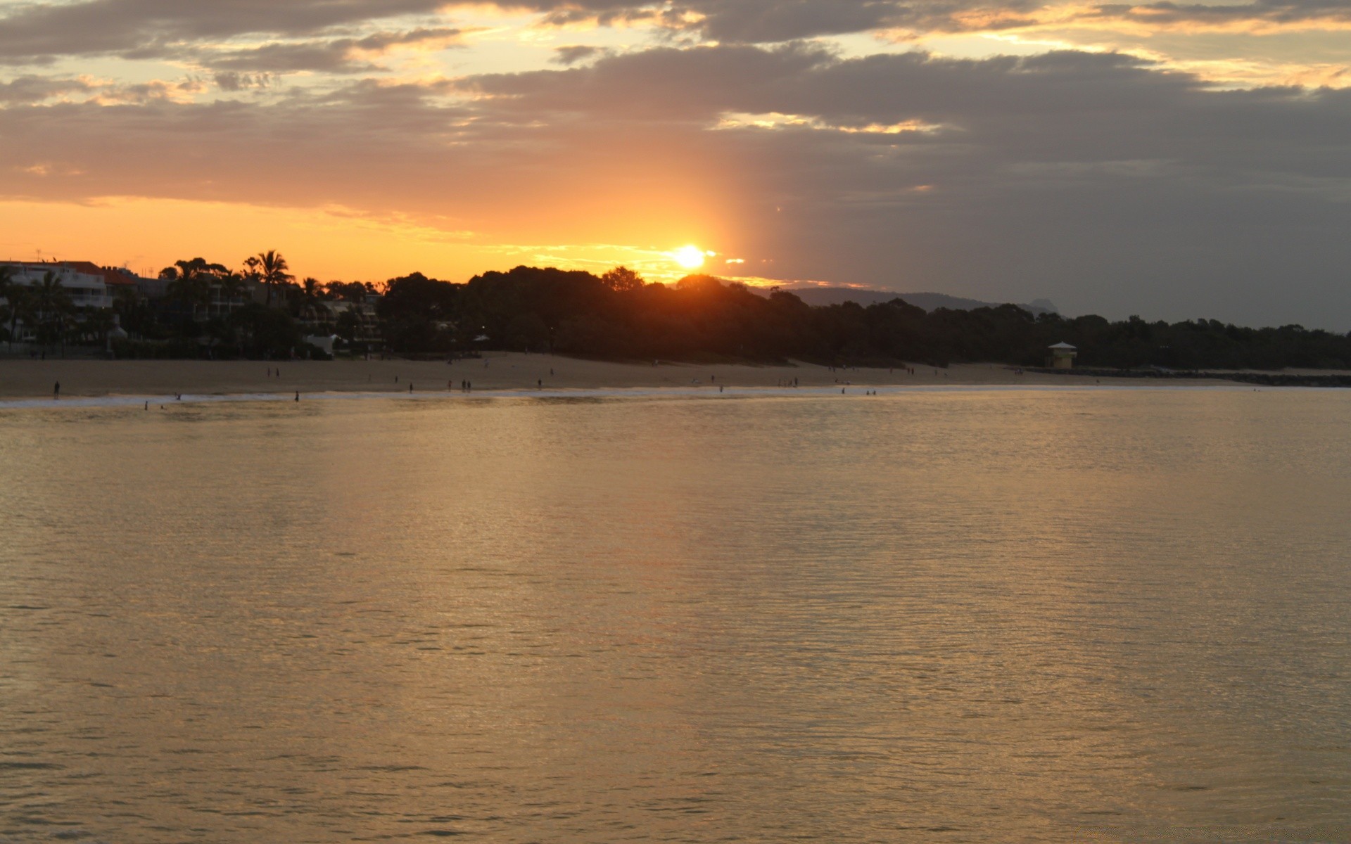 Puente sobre el fondo del océano y la puesta de sol reflejada en él
