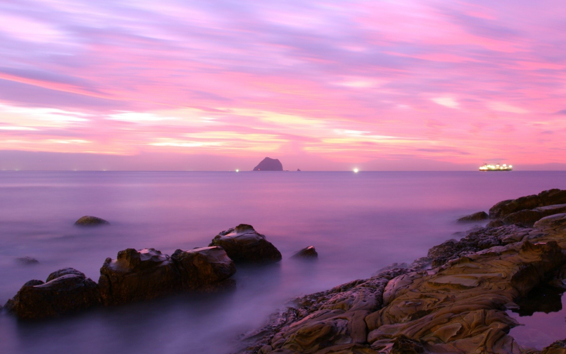 Barcos en el fondo de la puesta de sol vista a través de la hierba