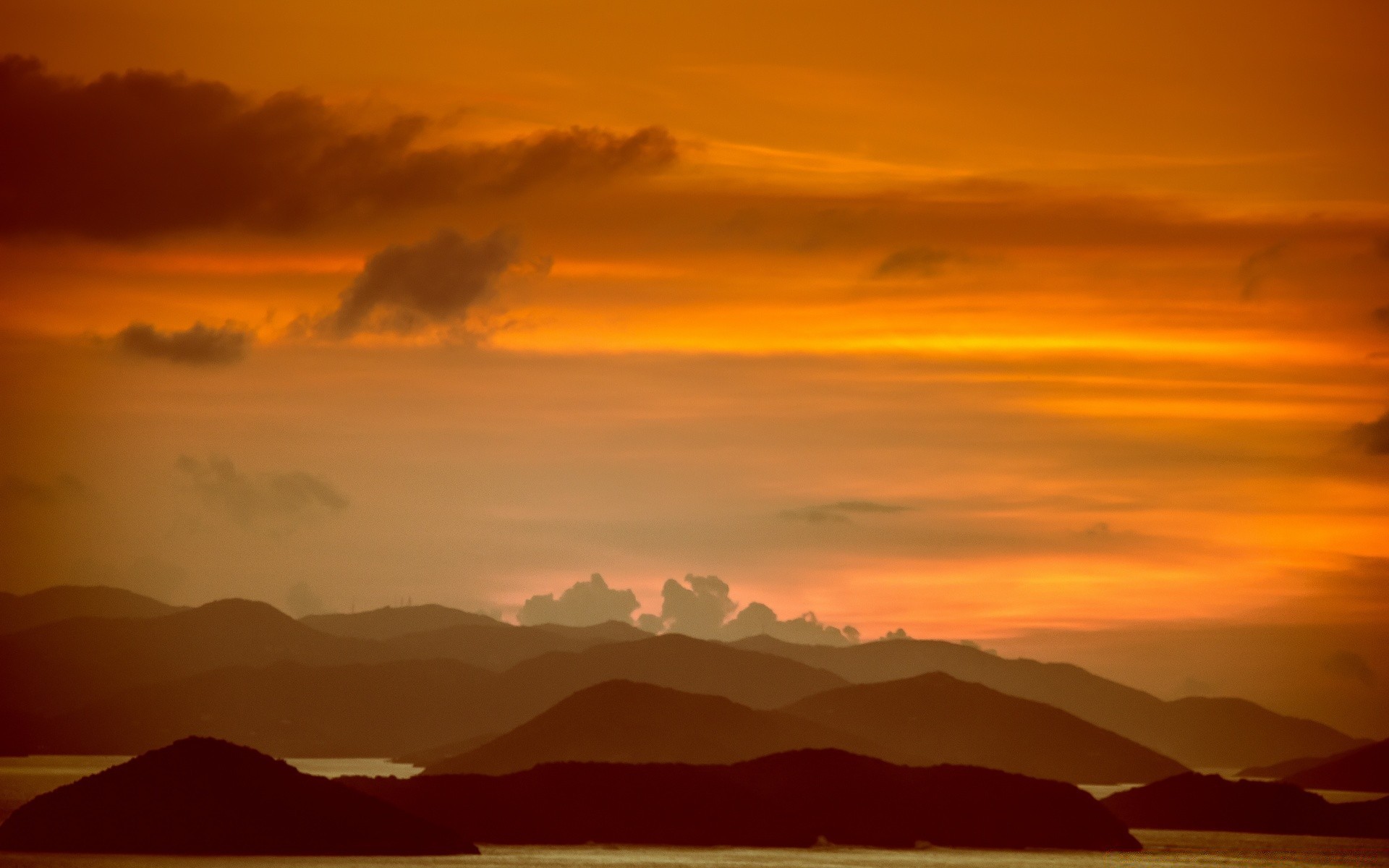 Puesta de sol sobre las montañas en el fondo del cielo nublado