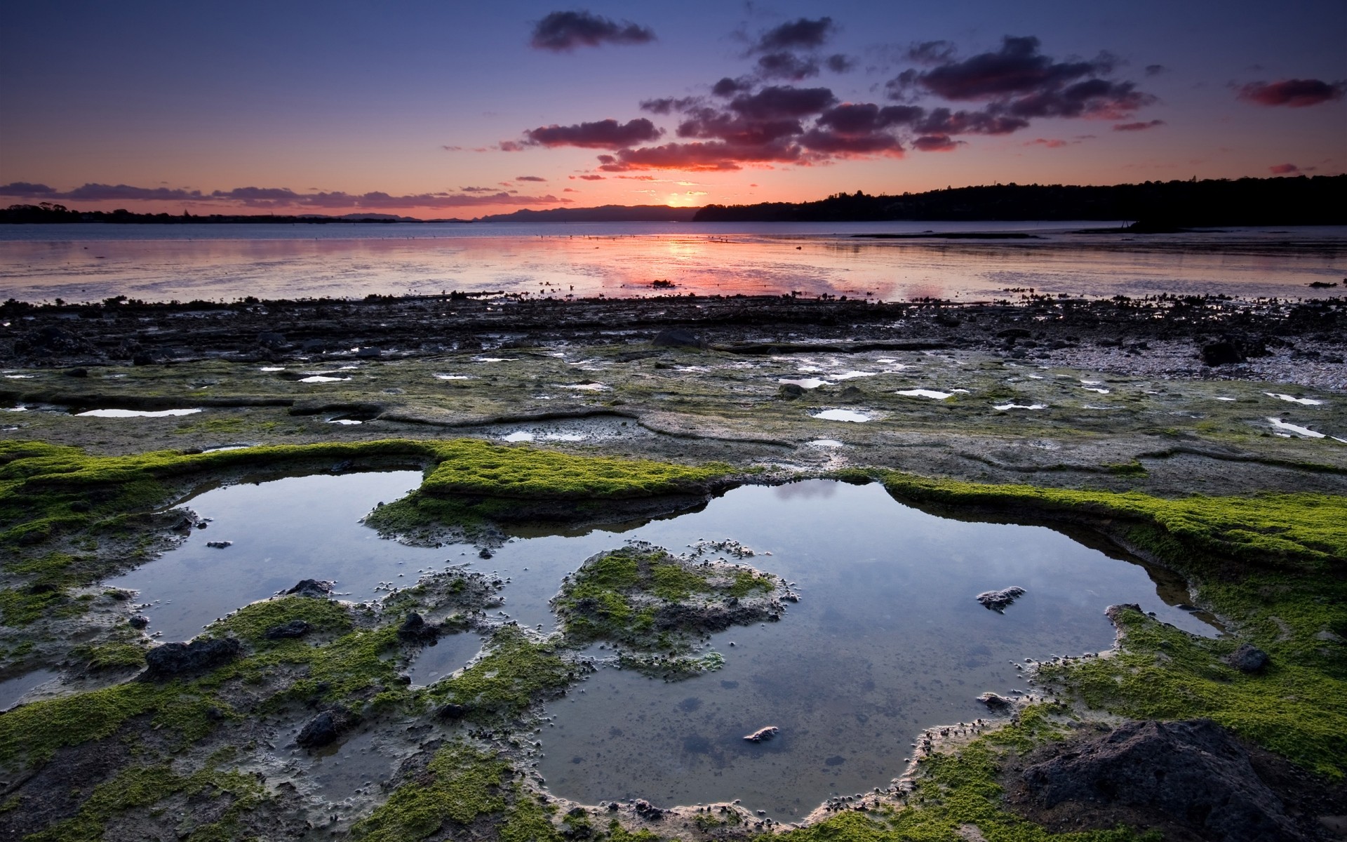 Una bahía en el océano con vistas a una colorida puesta de sol