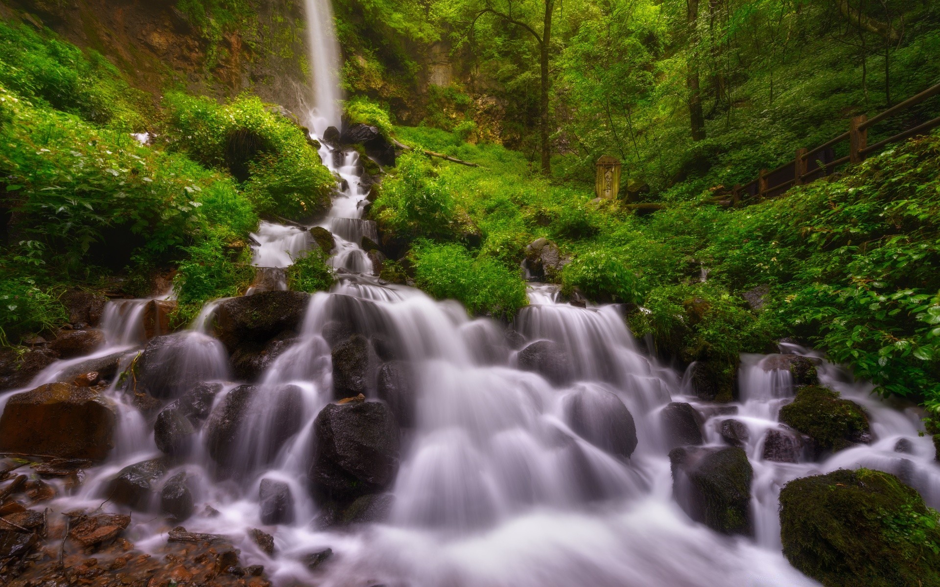 Una pequeña cascada entre las rocas y las hojas de los árboles de color amarillo verdoso en el bosque de otoño