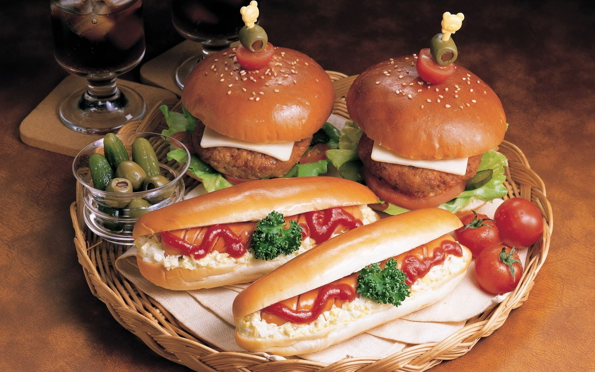 Cesta de hamburguesas, perritos calientes y verduras frescas y en escabeche
