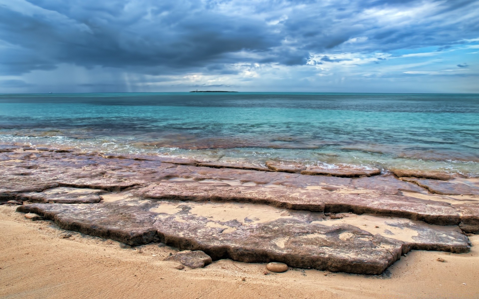 Costa de arena con rocas rocosas contra el mar agitadoCosta de arena con rocas rocosas contra el mar agitado