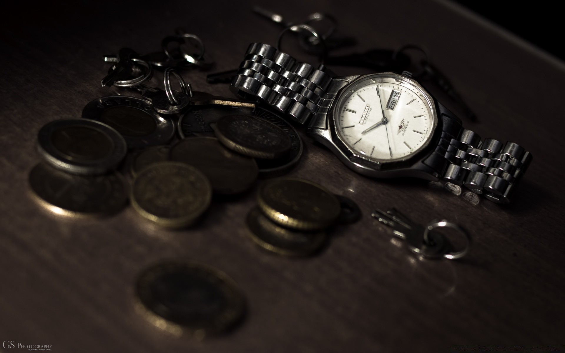 Reloj de mesa con monedas y llavero
