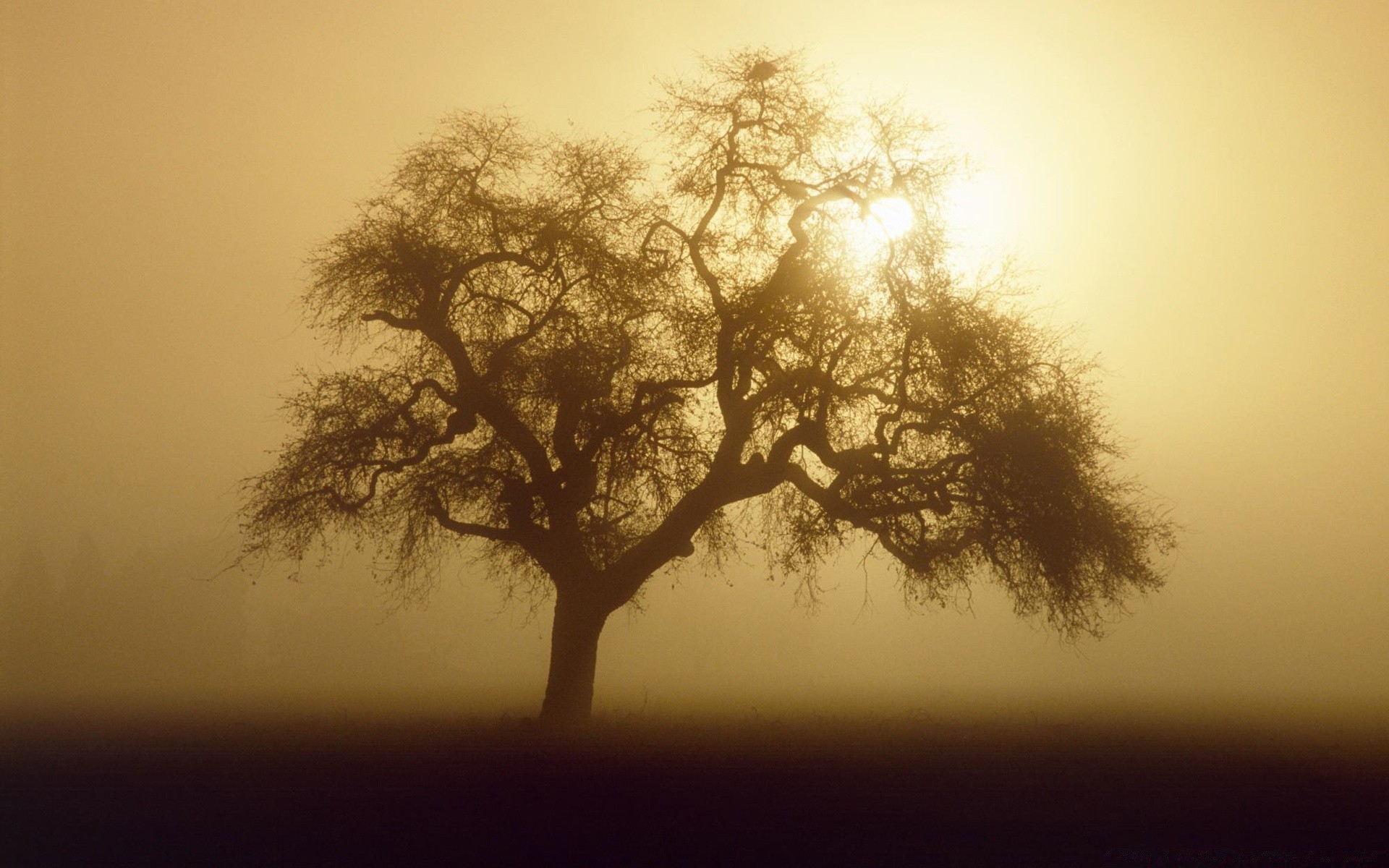 Paisaje brumoso con un árbol solitario