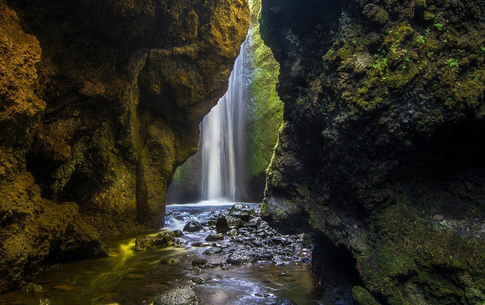 Viajeros solitarios en el fondo de un acantilado, rocas