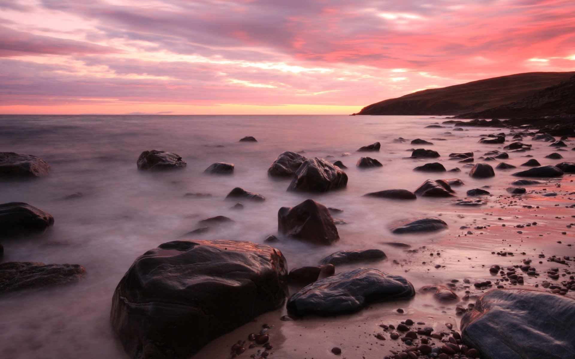 El frío amanecer del mar ilumina enormes rocas en la costa